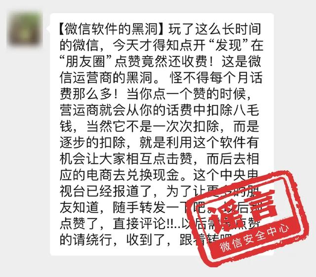用户在正常使用微信“朋友圈”点赞等基础功能过程中,不会被收取任何费用,请大家不要相信此类谣言,放心使用。