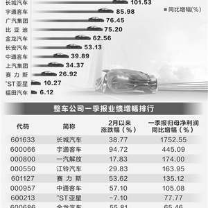 从业绩上看,整车上市公司今年一季度取得较好的成绩。一季报显示,16家整车上市公司中,有10家一季度归母净利润同比增长,其中6家增幅在100%以上,占比接近总数的四成,长城汽车、宇通客车、一汽解放增幅居前。