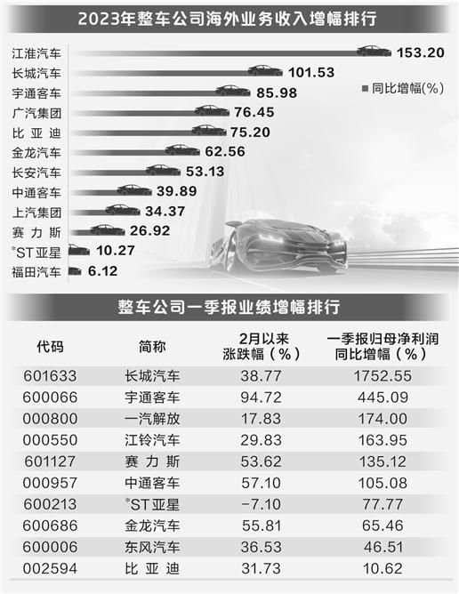 据证券时报·数据宝统计,A股中共有12家整车上市公司在年报中披露海外业务收入,2023年均实现同比增长,其中江淮汽车、长城汽车海外业务收入实现翻倍,分别同比增长153.2%和101.53%,比亚迪、上汽集团海外业务收入首次突破千亿元。