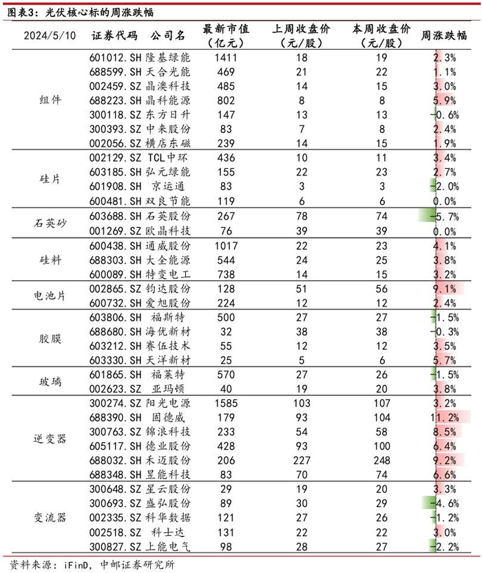 组件:5-6月组件排产基本稳定,5月支撑主要源于国内集采项目,一线厂商坚守0.88元/w的底线价格,然而部分订单调价后价格或跌破0.8元/w。