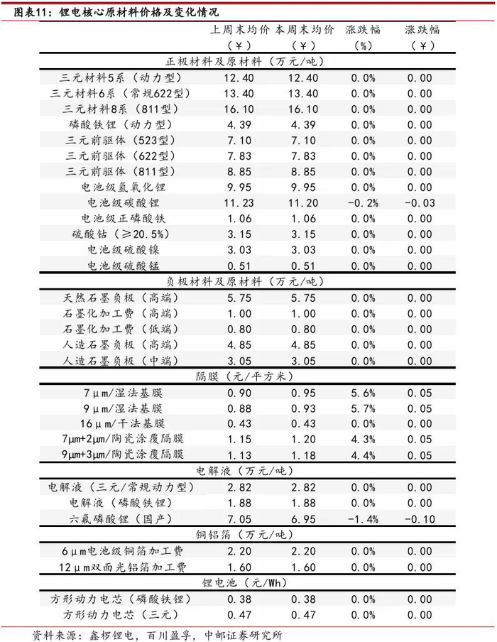 负极:下游电芯厂采购情绪转好,负极材料企业出货量上行,成品库存逐步消耗。但因负极材料供应过剩问题仍旧存在,负极材料实际成交价格延续低位。