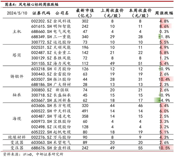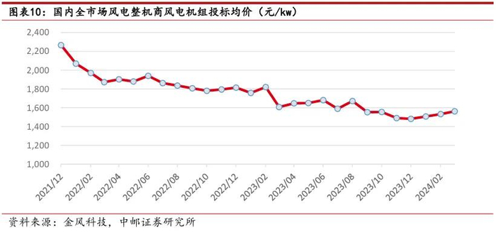 风机中标价格或已基本触底,主机竞争格局迎改善。5月7日,国电投风机集采中标候选公示,从结果来看,风机价格内卷在本次招标中得到缓解,陆上整机价格(含塔筒)重回2000元/kw时代。根据金风科技统计,2024年3月风机平均招标为1563元/kw,经历22-23年连续两年的风机价格竞争后,主机厂商盈利压力陡增,风机价格在24年有触底企稳迹象。