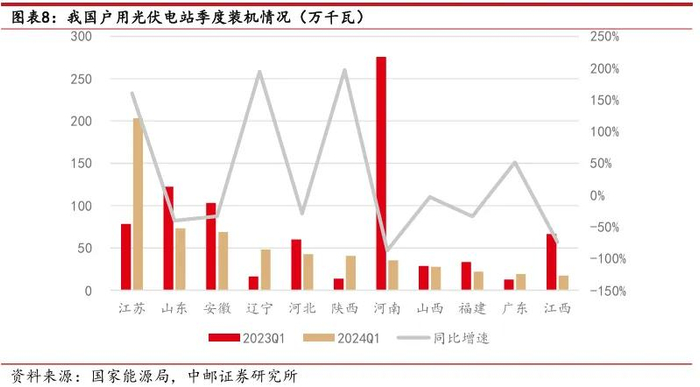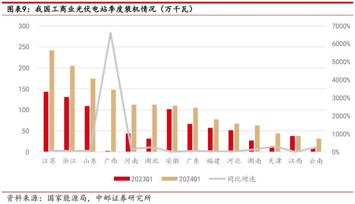 Ø工商业:不同于户用的接入受限,工商业装机一般会接入更高的电压等级,同时自发自用比例的提升也会降低消纳压力,24Q1工商业装机增幅最快,东部主要工业省份均实现工商业装机的大幅增长,如江苏2.42GW(+69%)、浙江2.05GW(+57%)、山东1.75GW(+60%)、广西1.48GW(+6618%),河南、湖北、广东新增装机也突破GW级,实现大幅增长。