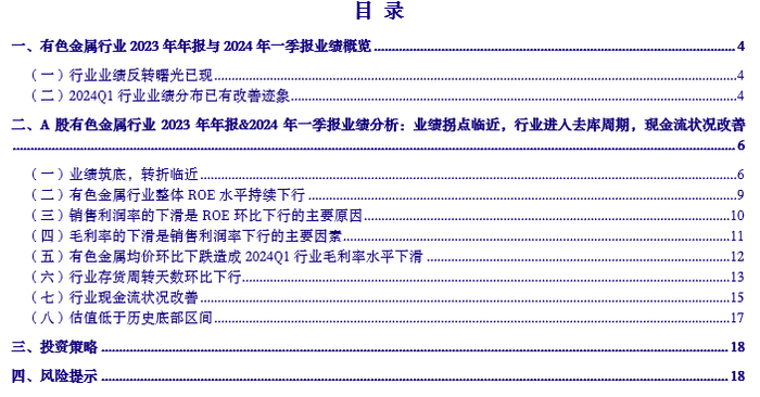 1. A股有色金属行业上市公司2023年营业收入同比增长1.94%,归属于母公司股东净利润同比减少20.26%;2024Q1单季度营业收入同比下滑4.14%,业绩同比下降29.16%。