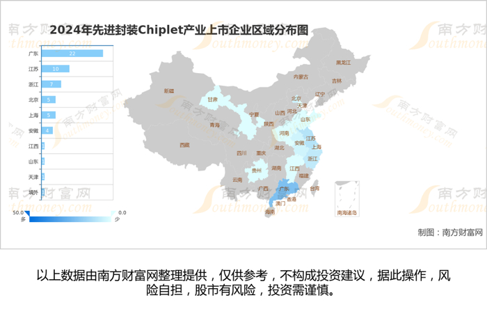 从上市公司地区的分布情况来看,A股60家先进封装Chiplet相关上市公司分布在广东、江苏、浙江、上海、北京等省市,总体来看主要集中于华东区域。