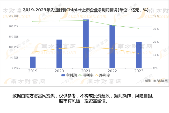 南方财富网产业链数据显示,2023年A股60家先进封装Chiplet相关上市公司总体归母净利润为124.23亿元,同比减少39.86%,低于2022年水平。从先进封装Chiplet行业利润率来看,2023年平均毛利率30.39%,较2022年有所下滑,平均净利率11.24%,较2022年有所下滑。