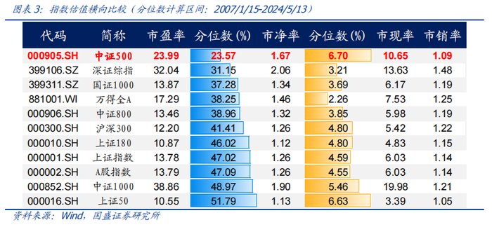 从与其他宽基指数横向对比来看,中证500指数的估值分位数较低,具有较高的安全边际。从同一历史区间计算的当前估值分位数对比来看,中证500指数的市盈率、市净率、市现率、市销率等常见估值指标的历史分位数相比于其他宽基指数而言较低,因此,横向与其他宽基指数对比来看,中证500指数的估值性价比较高。
