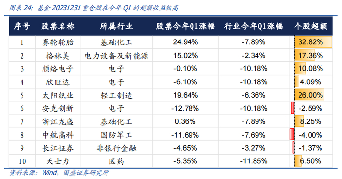 基金的超额收益主要源于选股能力优秀,行业内个股的优选和偏离给基金带来了较大的正超额贡献。我们基于2023/12/31基金的重仓股做了简单的测算归因,计算重仓股在接下来一个季度相对所属行业的超额收益,如下图所示,基金的前十大重仓股有7只都超越了行业本身的收益率,尤其是重仓的赛轮轮胎、格林美、顺络电子、太阳纸业等股票都取得了超越行业10%以上的超额回报。