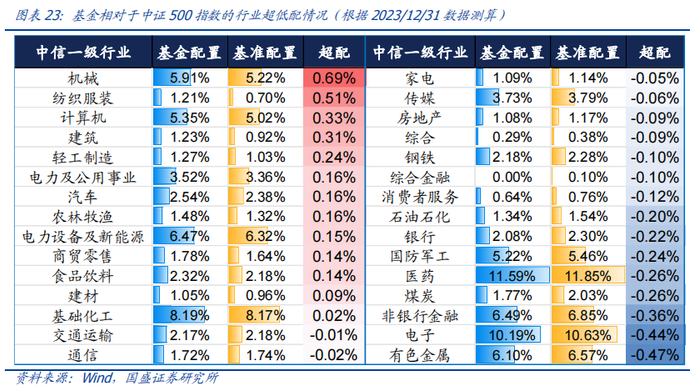 指增基金可以在指数行业配置基础上进行一定的偏离,本基金整体而言行业偏离幅度较小,不做过多的行业轮动。富安达中证500 指数增强A基金作为指数增强基金,允许在紧密跟踪指数的条件下,进行一定的行业上的偏离从而获取超越基准指数的超额收益。我们根据 2023年报披露基金持仓以及2023/12/31的中证500指数行业配置数据,计算了基金相对于中证500指数在行业上的超低配特征。从下图可以看到,相对于中证500指数而言,基金在机械、纺织服装、计算机、建筑、轻工制造等行业上超配最多,分别超配0.69%、0.51%、0.33%、0.31%、0.24%,基金在有色金属、电子、非银行金融、煤炭、医药等行业相对低配,分别超配-0.47%、-0.44%、-0.36%、-0.26%、-0.26%。可见该基金在行业层面偏离中证500的程度较小,紧跟基准的行业配置,而不做过多行业轮动,更多凭借行业内优选个股获取超额收益。