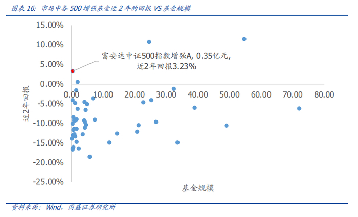 从今年以来的业绩来看,富安达中证500指数增强基金在市场所有500增强基金中业绩领跑,未来产品规模有望进一步提升。从与市场中其他以中证500指数为基准的指数增强型基金对比情况来看,从近2年累计回报可以看到富安达中证500指数增强基金A为3.23%,领先于市场中绝大多数其他同类型500增强基金,在同类基金中近2年回报位居前列。而从当前规模来看,富安达中证500指数增强基金规模仍比较小,A类份额仅0.35亿元,未来预计还有非常大的规模提升潜力,有望实现规模增长与业绩提升的正向反馈。