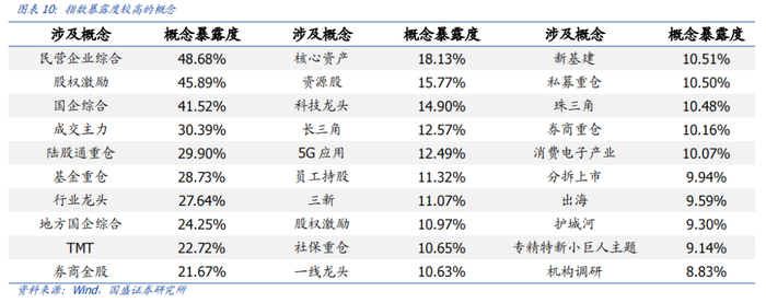 从指数成分股涉及概念来看,指数在各概念主题上暴露较均衡,在行业龙头、基金重仓等概念上的暴露相对较高。从相关概念来看,指数在行业龙头、基金重仓等概念的暴露度最高,分别为27.64%、28.73%。整体来看,由于指数成分股数量较多且分散度较高,各类概念暴露度不算极致,指数持仓同时兼顾多个主题概念,例如TMT、资源股、科技龙头等概念上的暴露也较高,分别为22.72%、15.77%、14.90%。