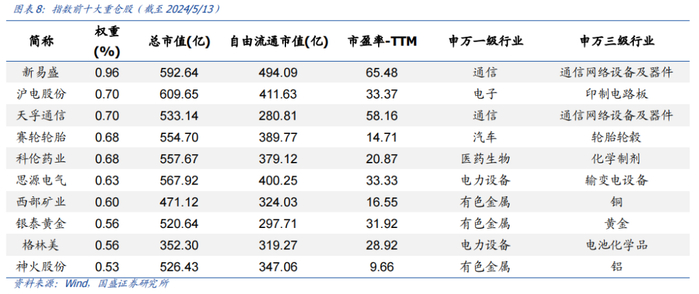 指数成分股的分散度较高。指数成分股数量较多,截至2024年5月13日,前十大个股累计权重仅为6.58%,个股权重分布较分散。从指数前十大成分股来看,持仓权重最大的5只股票分别为新易盛、沪电股份、天孚通信、赛轮轮胎、科伦药业。