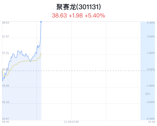 05月15日,聚赛龙(301131)股价大幅上涨,截至10点37分,聚赛龙上涨5.40%,报38.63元/股,成交3251万元,换手率3.77%,振幅6.71%。