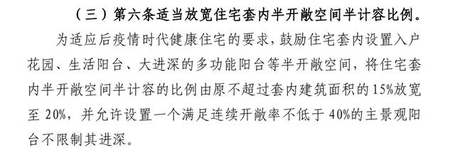 在业主关注的房屋内部空间方面,《若干措施》提出,主景观阳台开敞率达到40%的不限制进深,进深不超出2.4米的部分按一半计算容积率面积;阳台进深超出2.4米的部分面积全计容。住宅建筑每户阳台面积占套内户型面积比例不超过25%的部分,按一半计容积率面积;超出部分面积全计容,提高房屋得房率。