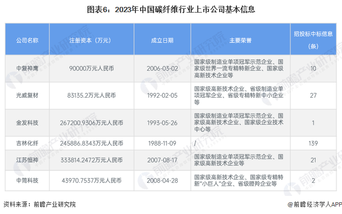 从行业的上市企业布局和已有公开信息分析,注册资本最多的是江苏恒神,而成立时间最早的是吉林化纤,2023年招投标中标信息最多的则是吉林化纤。