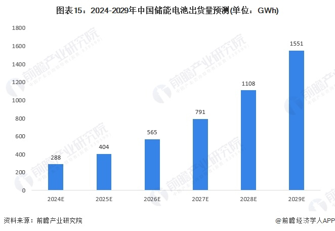 随着政策支持力度加大、电力制度商业化、商业模式的成熟化,储能锂电池装机量将保持加速增长,十四五时期储能锂电池有望进入商业化加速期。根据高工产研锂电研究所(GGII)预测,至2025年中国储能锂电池出货量有望达到430GWh,年均复合增长率达50%左右。结合全球储能电池市场增长情况,前瞻预计到2029年,中国储能电池出货量有望达到1551GWh,2024-2029年年均复合增长率在40%左右。