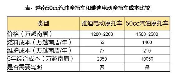 在越南,一辆50cc燃油摩托车和电动摩托车的售价差不多,最大的差别是燃料成本和维护成本。