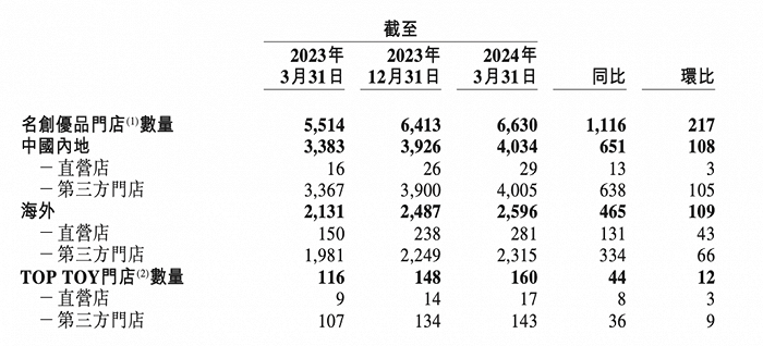 2020年12月推出的潮玩新品牌TOP TOY专造IP,品牌外采与原创产品的比例约为7:3。在2024年Q1,TOP TOY的表现亦十分亮眼,收入同比增长55.1%;平均单店收入亦同增26%。截至2024年Q1末,TOP TOY门店160家,同比增长32.2%,较年初再增加12家。