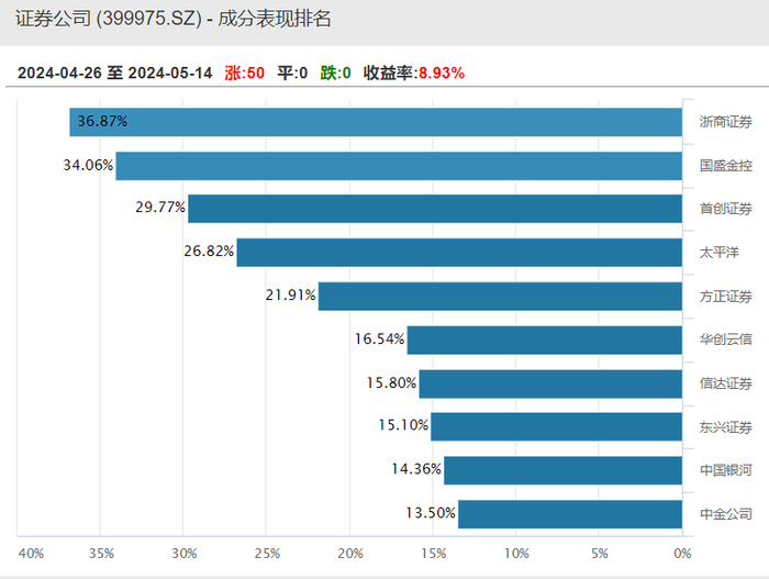 公开数据显示,4月26日至5月14日,中证证券公司指数(399975)的区间涨幅为8.93%,50只券商股全部录得上涨。成分股中,涨幅最大的浙商证券区间大涨36.87%,国盛金控涨逾34%,首创证券、太平洋和方正证券等热门重组股的短期涨幅均超过20%。