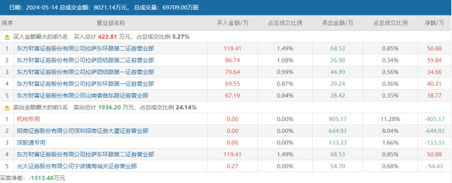 虽然已经提前锁定退市,但值得注意的是,5月14日,*ST保力的资金交投活跃度却不低,全天成交额近8000万元,大幅高于月内均值水平(1800万元)。从其当日龙虎榜数据上看,“拉萨天团”成为入场主力,买入榜前五席位中四席为东方财富证券拉萨相关营业部,合计净买额近186万元。而在卖出榜前五席位中,一家机构席位净卖出近905万元,深股通席位也净卖出近133万元。