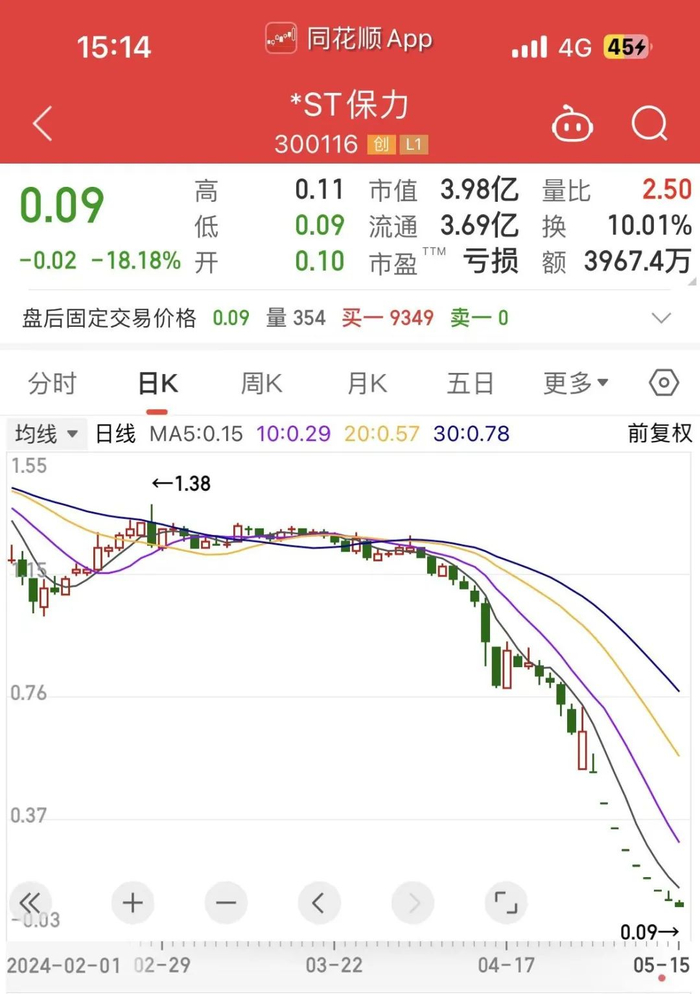 15日,截至收盘,*ST保力股价跌18.18%,报0.09元,为目前A股市场中的最低股价。