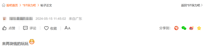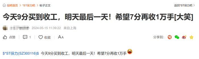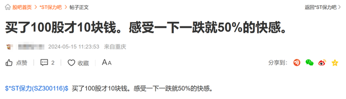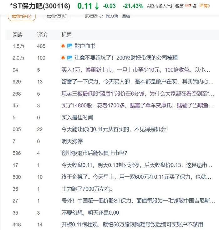 在*ST保力的股吧中,小散留言潮涌。有投资者发帖表示,“买入1万,搏重新上市,一旦上市至少10元,100倍收益。以小博大。毕竟这是新能源”;还有投资者表示,“买了14800股,花费1700多元,赌赢了单车变摩托,赌输了当喂鱼了”。
