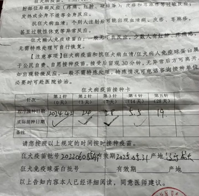 当天,家人就带孩子注射了狂犬病疫苗,但乡下缺少狂犬病免疫球蛋白,又因孩子伤势严重,家人立刻带孩子赶往南阳市,最后找到一个24小时犬伤处理预防接种综合门诊,清洗了伤口并注射狂犬病免疫球蛋白。