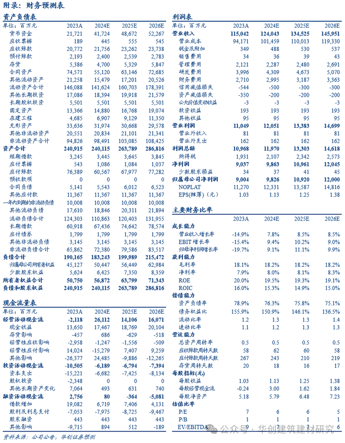 盈利维持较高水平,现金流承压。公司2023年综合毛利率为18.14%,同比+1.09pct,创历史新高,主要系高毛利业务占比提升。净利率为7.86%,同比-0.55pct。期间费率7.7%,同比+1.3pct。2023年经营性现金流净额-21.18亿元,同比-115.82%,主要系 2022 年末集中收到开工预付款项,资金于2023 年完成支付所致。资产负债率78.93%,同比+1.01pct。分红方面,公司计划2023年现金分红达45.06亿元,占业绩比例超50%。