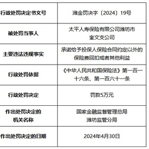 中国经济网北京5月15日讯 国家金融监督管理总局网站6日公布的行政处罚决定书(潍金罚决字〔2024〕19号、20号、21号)显示,太平人寿保险有限公司潍坊市奎文支公司承诺给予投保人保险合同约定以外的保险费回扣或者其他利益,国家金融监督管理总局潍坊监管分局依据《中华人民共和国保险法》第一百一十六条、第一百六十一条对该公司罚款5万元。
