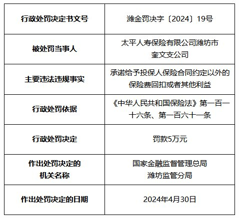 太平人寿潍坊奎文支公司被罚 承诺给予合同约定外利益