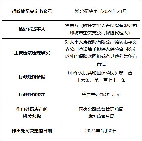 时任太平人寿保险有限公司潍坊市奎文支公司保险代理人管爱芬,对太平人寿保险有限公司潍坊市奎文支公司承诺给予投保人保险合同约定以外的保险费回扣或者其他利益负有责任,国家金融监督管理总局潍坊监管分局依据《中华人民共和国保险法》第一百一十六条、第一百七十一条对管爱芬警告并处罚款1万元。