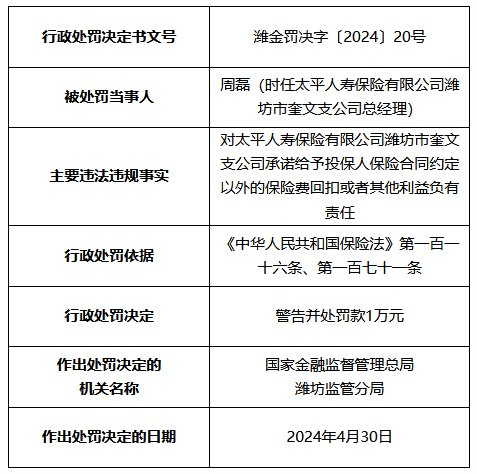 时任太平人寿保险有限公司潍坊市奎文支公司总经理周磊,对太平人寿保险有限公司潍坊市奎文支公司承诺给予投保人保险合同约定以外的保险费回扣或者其他利益负有责任,国家金融监督管理总局潍坊监管分局依据《中华人民共和国保险法》第一百一十六条、第一百七十一条对周磊警告并处罚款1万元。