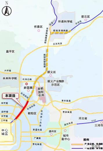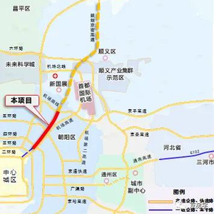 根据批复,这段道路位于朝阳区、顺义区,南起机场南线,北至六环路,全长约15公里。其中,主路将按照高速公路标准建设,采用高架桥形式,机动车道三上三下;