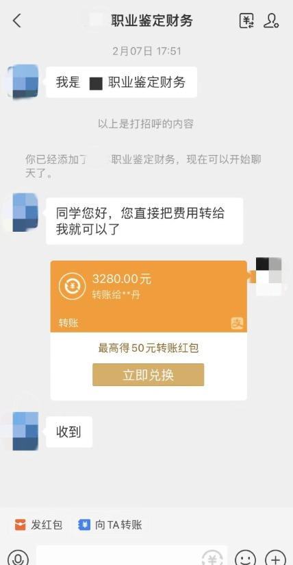 詹女士将自己的报考信息发送给所谓技能鉴定中心“招生老师”,还给“班主任”支付了3000多元学习费。