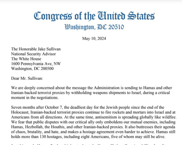 民主党26名议员向美国国家安全顾问杰克·沙利文致联名信,对美国政府暂停为以色列运输军火表示“极度担忧”,指出此举将向哈马斯和伊朗发出错误信号。各议员认为美国有责任为以色列提供资源进行自卫,协助以色列击败“寻求伤害美国的恐怖分子”。