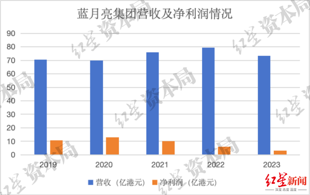财报显示,2019-2023年,蓝月亮的营收分别为70.50亿港元、69.96亿港元、75.97亿港元、79.47亿港元、73.24亿港元;营收增速分别为4.17%、-0.76%、8.59%、4.60%、-7.84%,业绩整体增长较为缓慢。