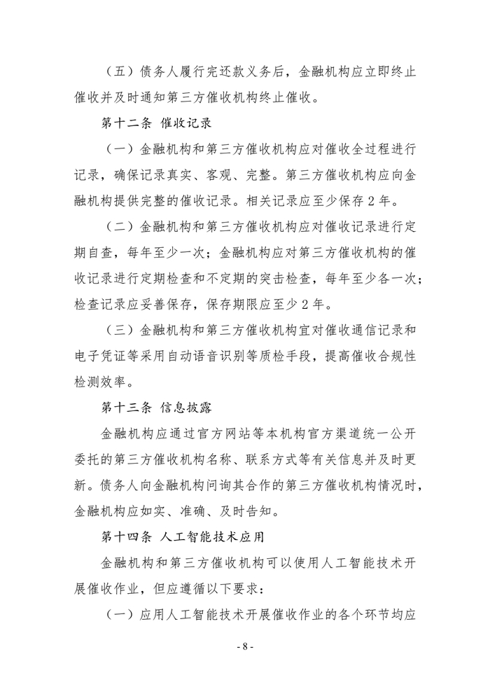 催收记录方面,《指引》提及,金融机构和第三方催收机构应对催收全过程进行记录,确保记录真实、客观、完整。第三方催收机构应向金融机构提供完整的催收记录。相关记录应至少保存2年。