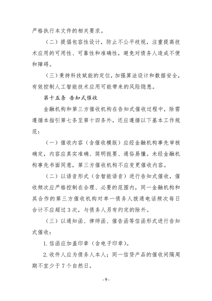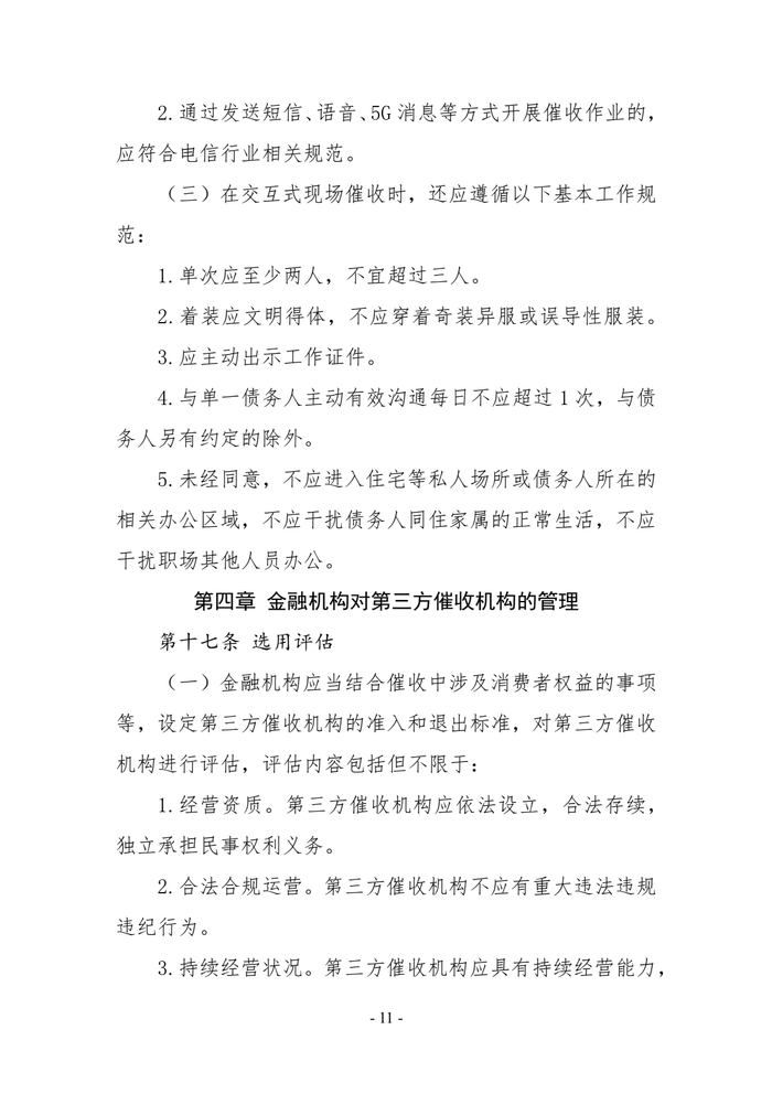 《指引》还提及,以语音形式(含智能语音)进行告知式催收,催收频次应严格控制在合理、必要的范围内,同一金融机构和其合作的第三方催收机构对单一债务人拨通电话频次每日合计不应超过3次,与债务人另有约定的除外。在交互式现场催收时,与单一债务人主动有效沟通每日不应超过1次,与债务人另有约定的除外;未经同意,不应进入住宅等私人场所或债务人所在的相关办公区域,不应干扰债务人同住家属的正常生活,不应干扰职场其他人员办公。
