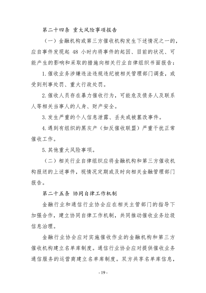重大风险事项报告方面,《指引》明确了金融机构或第三方催收机构发生下述情况之一的,应自事件发现起48小时内将事件的起因、目前的状况、可能产生的影响和采取的措施向相关行业自律组织书面报告。