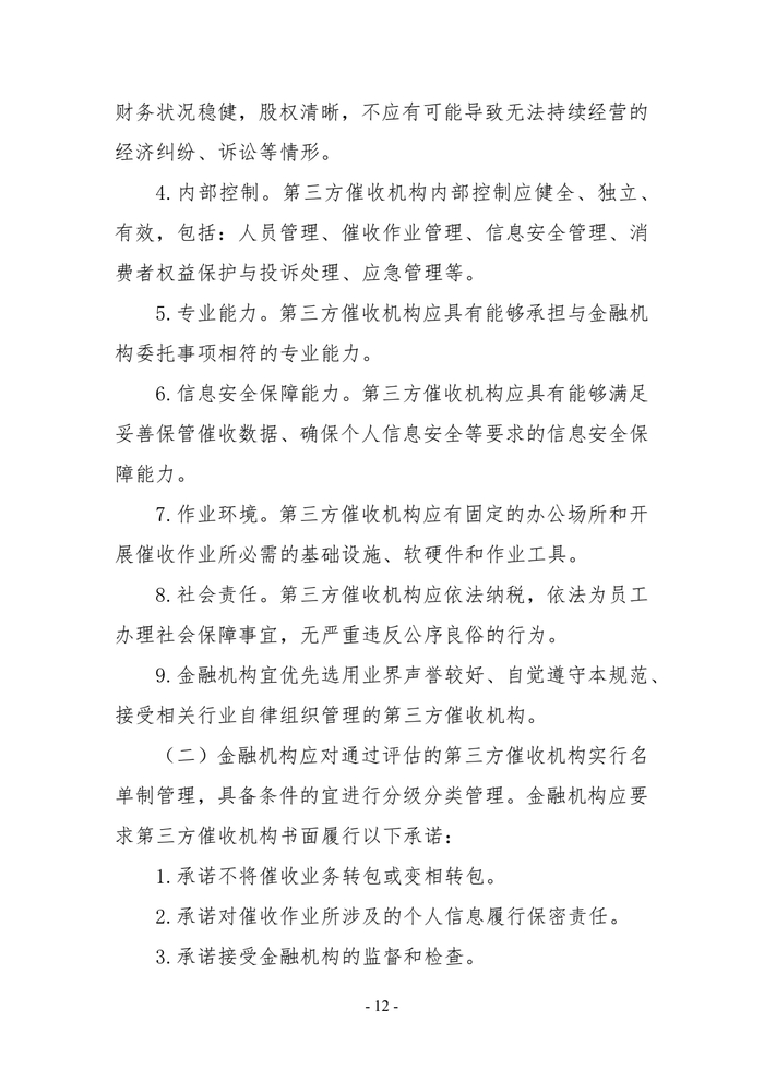 金融机构应当结合催收中涉及消费者权益的事项等,设定第三方催收机构的准入和退出标准,对第三方催收机构进行评估,评估内容包括但不限于:经营资质、合法合规运营、持续经营状况、内部控制、专业能力、信息安全保障能力、作业环境、社会责任等。
