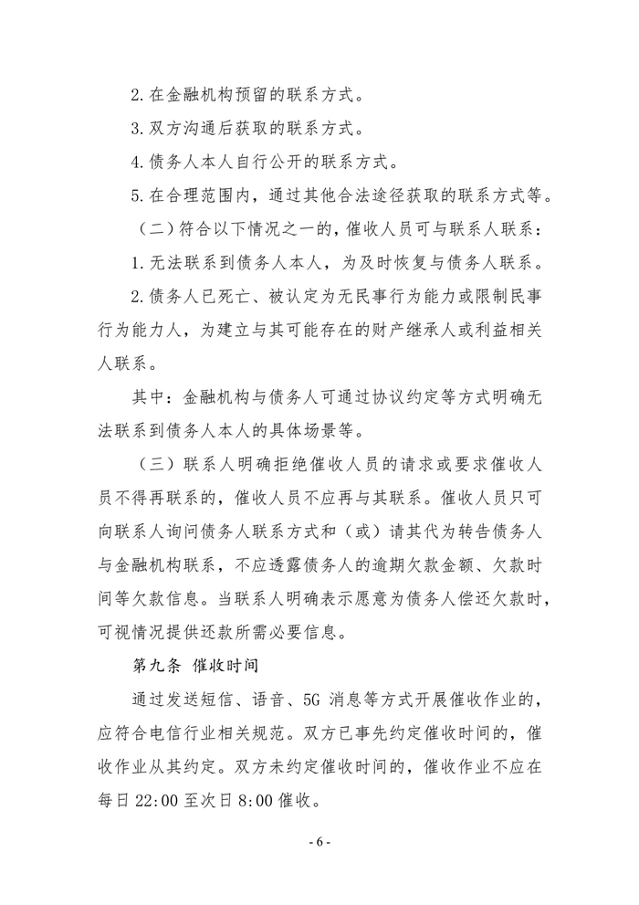 其中,在催收对象方面,《指引》明确提及,金融机构和第三方催收机构应只向债务人催收,不应向联系人催收。符合以下情况之一的,催收人员可与联系人联系,包括无法联系到债务人本人,为及时恢复与债务人联系;债务人已死亡、被认定为无民事行为能力或限制民事行为能力人,为建立与其可能存在的财产继承人或利益相关人联系;金融机构与债务人可通过协议约定等方式明确无法联系到债务人本人的具体场景等。联系人明确拒绝催收人员的请求或要求催收人员不得再联系的,催收人员不应再与其联系。