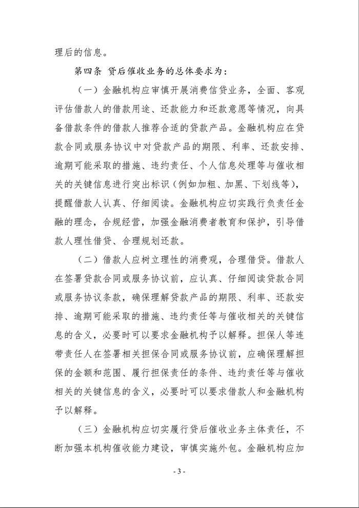 贷后催收业务的总体要求提及,金融机构应审慎开展消费信贷业务,全面、客观评估借款人的借款用途、还款能力和还款意愿等情况,向具备借款条件的借款人推荐合适的贷款产品;借款人应树立理性的消费观,合理借贷,在签署贷款合同或服务协议前,应认真、仔细阅读贷款合同或服务协议条款,确保理解贷款产品的期限、利率、还款安排、逾期可能采取的措施、违约责任等与催收相关的关键信息的含义,必要时可以要求金融机构予以解释;金融机构应切实履行贷后催收业务主体责任,不断加强本机构催收能力建设,审慎实施外包。