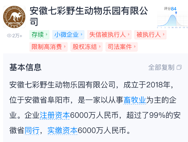 据了解,阜阳野生动物园运营方为安徽七彩野生动物乐园有限公司。而该公司涉及风险提示72条,曾因租赁合同纠纷等被起诉。