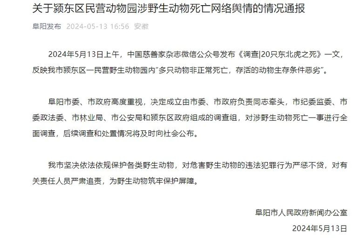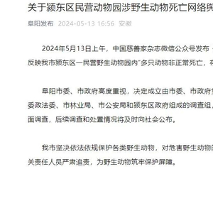 5月13日,阜阳野生动物园发布公告称,因升级改造闭园三天。同日下午,阜阳市人民政府新闻办公室就此事发布通报,详情如下:
