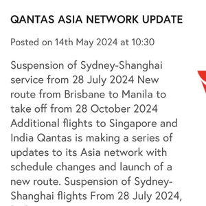 5月14日,澳洲航空(Qantas Airways)官网发布《澳航亚洲航线网络更新》的通知。通知称,2024年7月28日起澳航将暂停运营悉尼-上海航线,释放出的飞机运力会重新定向,转投至新加坡、印度、马尼拉等亚洲区域内其他目的地。