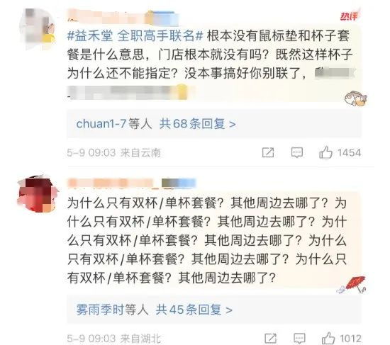 “我是5月9日上午11点在益禾堂小程序下单购买了价格为81.9元和46元的两单产品,购买单据显示周边赠品包括鼠标垫两套、贴纸四张、全套明信片两套和不锈钢杯一个。线下门店取货时发现,店里的管理十分混乱,取号在我之后的人反而提前拿到了周边。我在店内等了30分钟,等排到我时被告知赠品没有了。”