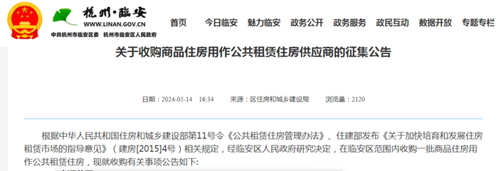 证券时报·e公司记者注意到,5月14日,杭州市临安区住房和城乡建设局发布《关于收购商品住房用作公共租赁住房供应商的征集公告》,在临安区范围内收购一批商品住房用作公共租赁住房。