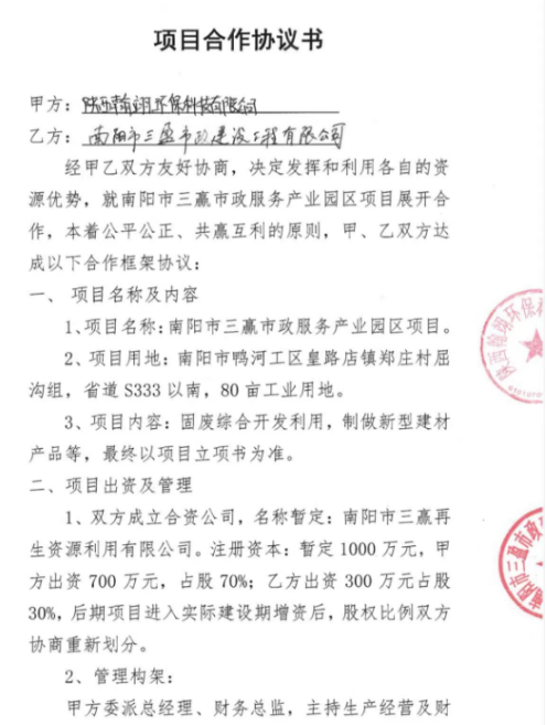 三赢再生公司法定代表人白永红介绍,2020年8月,通过南阳市城管局的招商引资活动,拥有废渣处理技术的翰翊环保通过一系列市场调研后决定在南阳当地投资建厂。翰翊环保与当地政府达成合作模式,由三盈市政与翰翊环保共同出资组建一家新公司,即“南阳市三赢再生资源利用有限公司”,公司将在当地投资建厂,对南阳当地垃圾焚烧后产生的炉渣进行再生利用。