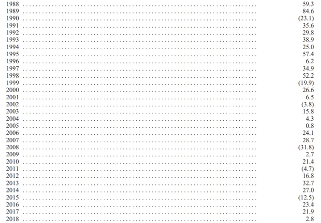 1988-2018年,大奖章基金实现了每年费前正收益,市场表现越是不好,基金的表现反而越好(无论以市场指数,还是获得诺奖的法玛三因子衡量,大奖章基金的贝塔都是负的),31年平均收益率66.1%,费后平均收益率39.1%的奇迹。