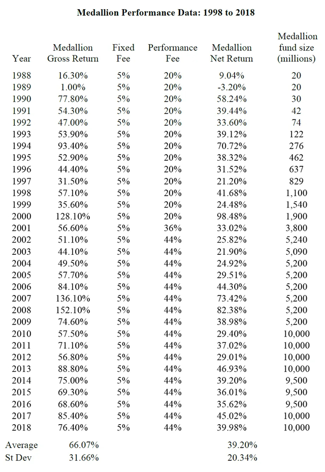 要知道,对冲基金的行规收费结构是2-20,也就是2%的管理费和20%的利润提成。而大奖章基金的收费结构前13年是5-20,后17年是5-44,剩下中间一年是5-36。